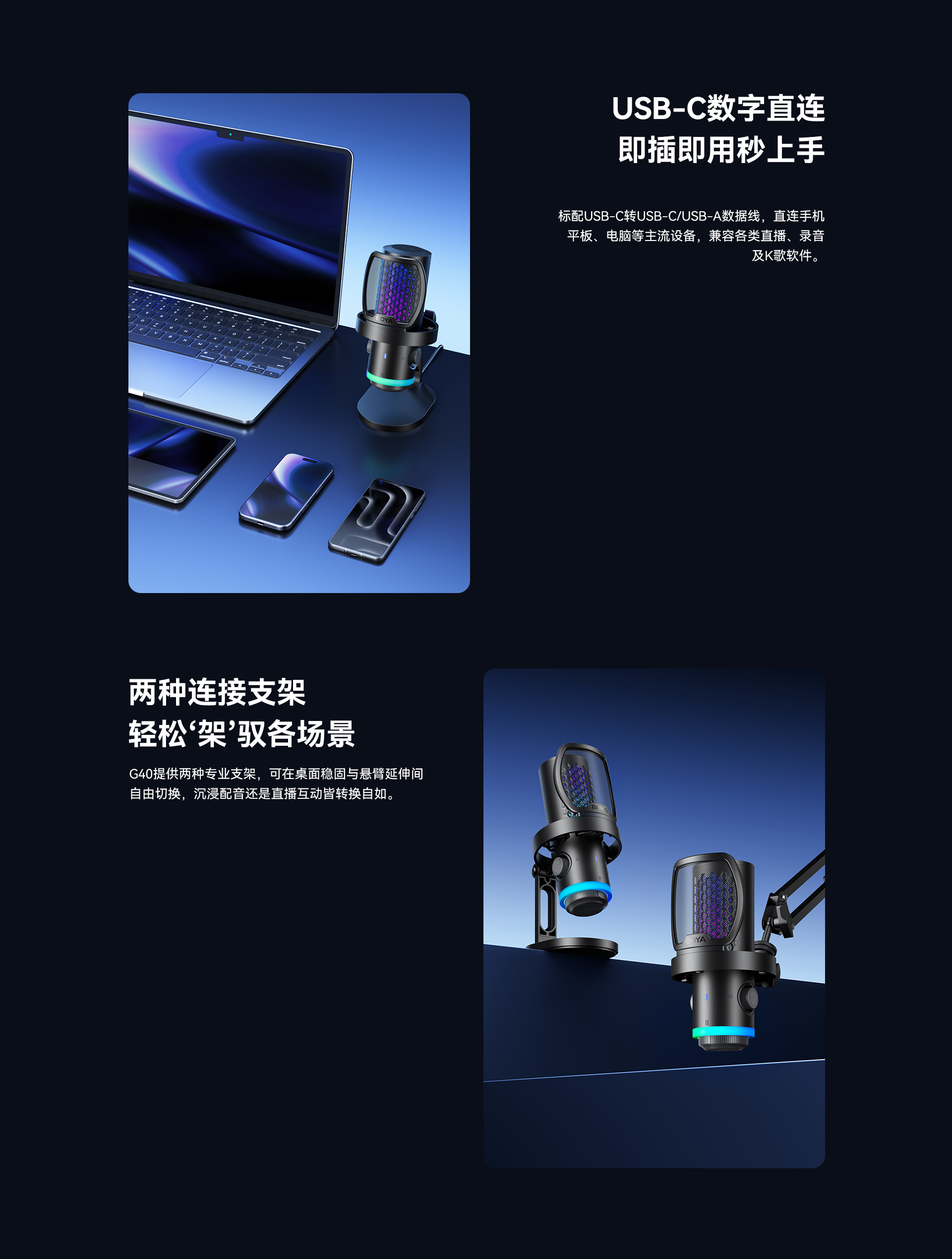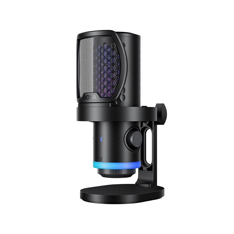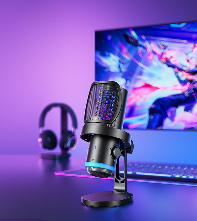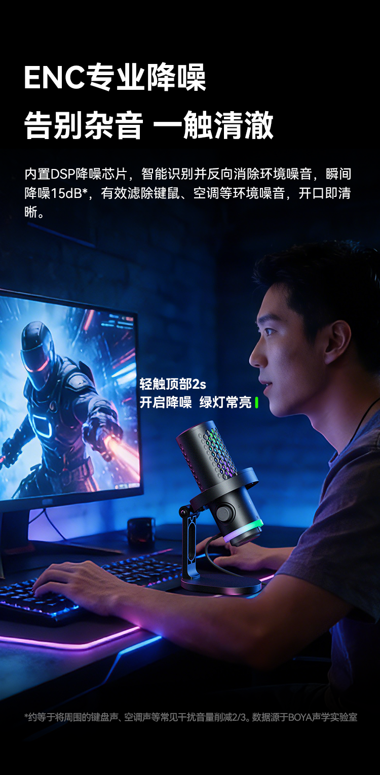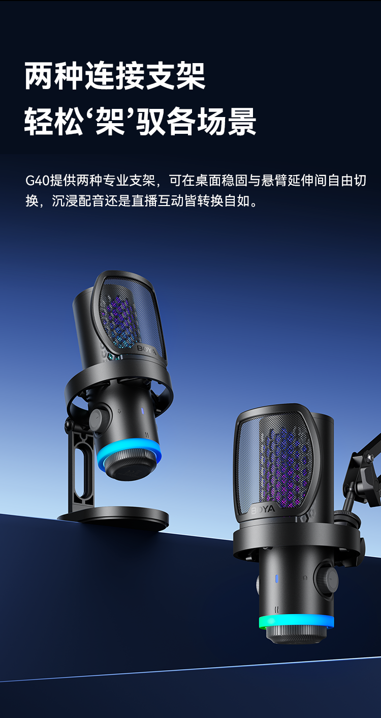 BOYA CastMic G40是一款集高音质录音与炫酷RGB灯效于一体的电容式游戏麦克风。内置192kHz/24bit高采样率声卡,ENC降噪算法搭配DSP芯片清晰收音,设置麦克风/耳机/混音比例三区增益调控旋钮,支持3.5mm耳机监听,USB接口直连手机、平板或电脑来录制音频,从游戏开黑、直播互动到专业内容创作,G40皆能胜任。