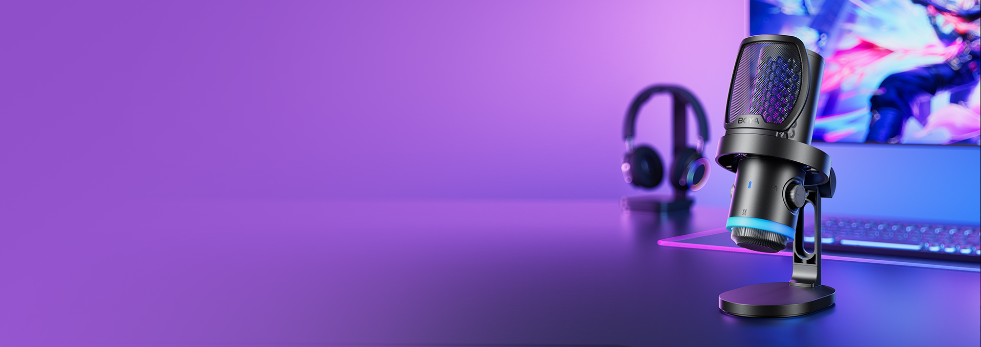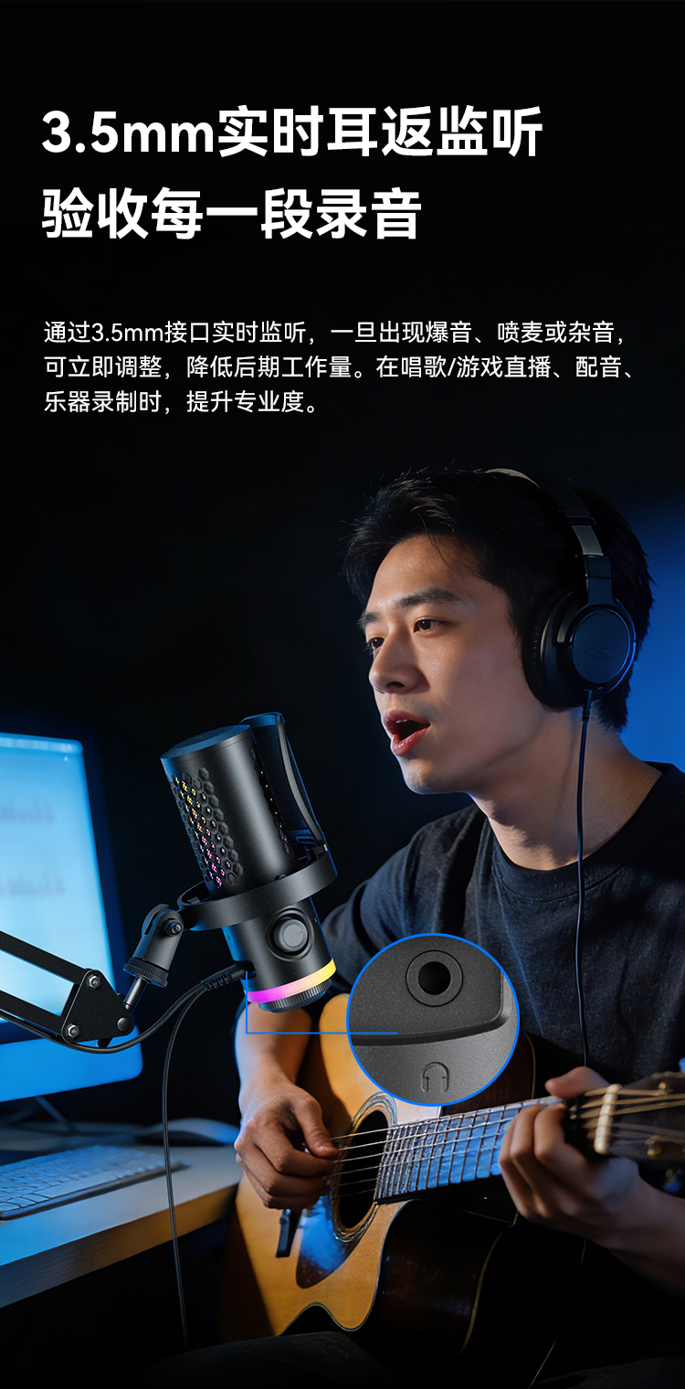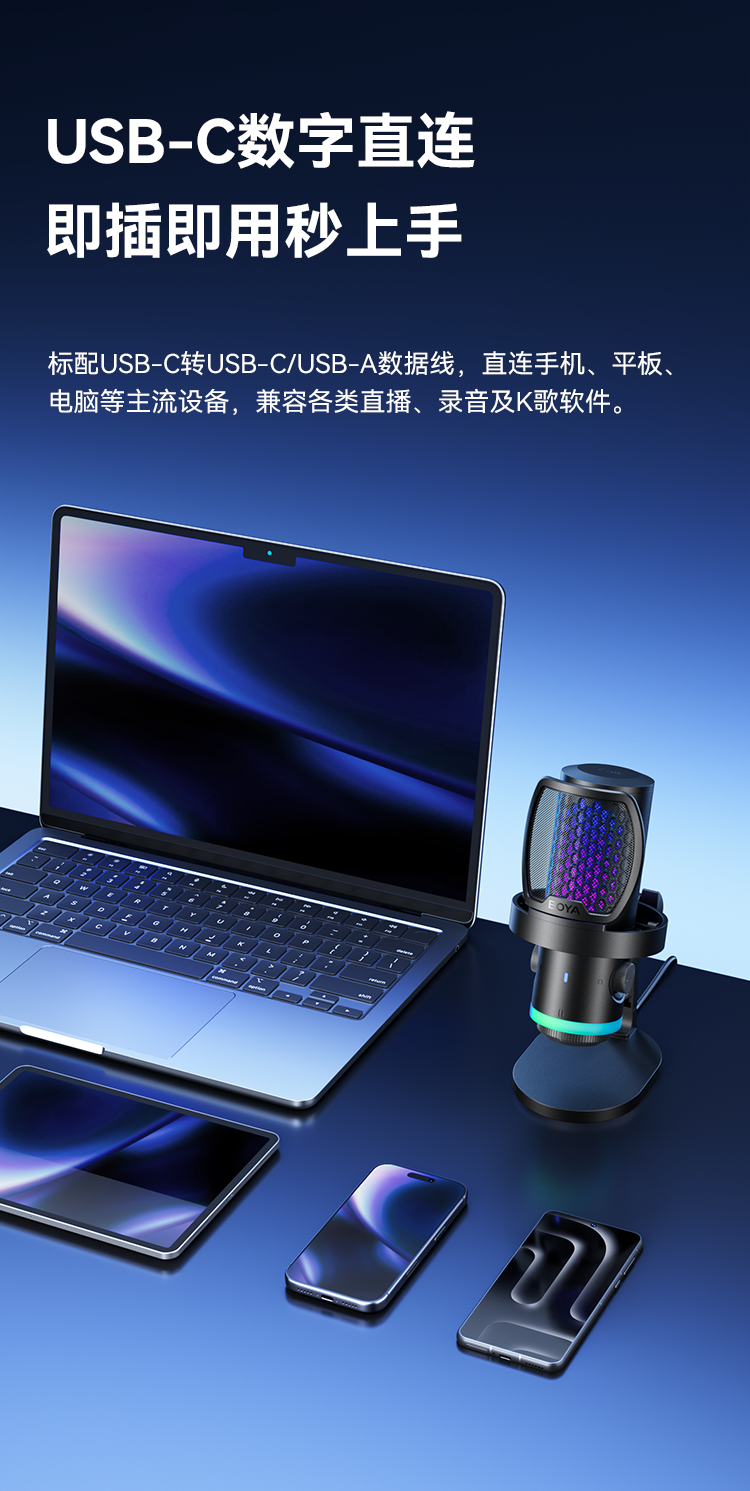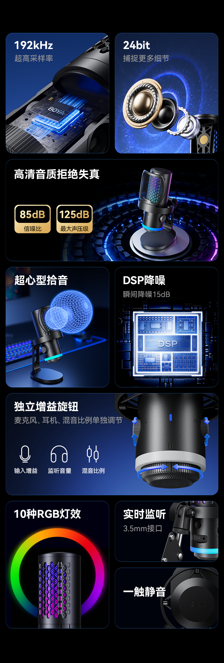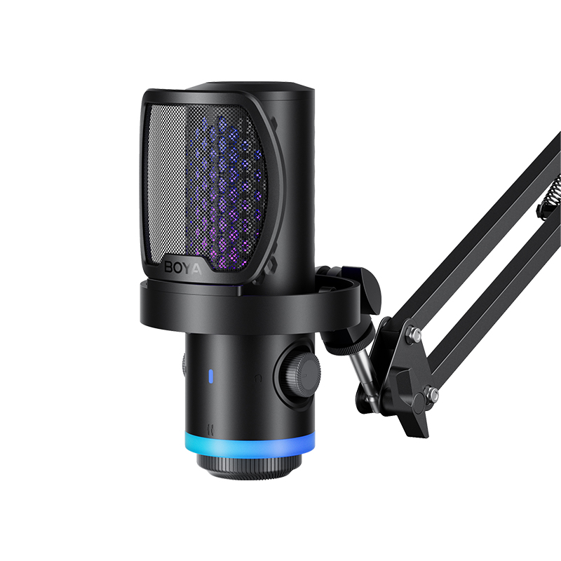 BOYA CastMic G40是一款集高音质录音与炫酷RGB灯效于一体的电容式游戏麦克风。内置192kHz/24bit高采样率声卡,ENC降噪算法搭配DSP芯片清晰收音,设置麦克风/耳机/混音比例三区增益调控旋钮,支持3.5mm耳机监听,USB接口直连手机、平板或电脑来录制音频,从游戏开黑、直播互动到专业内容创作,G40皆能胜任。