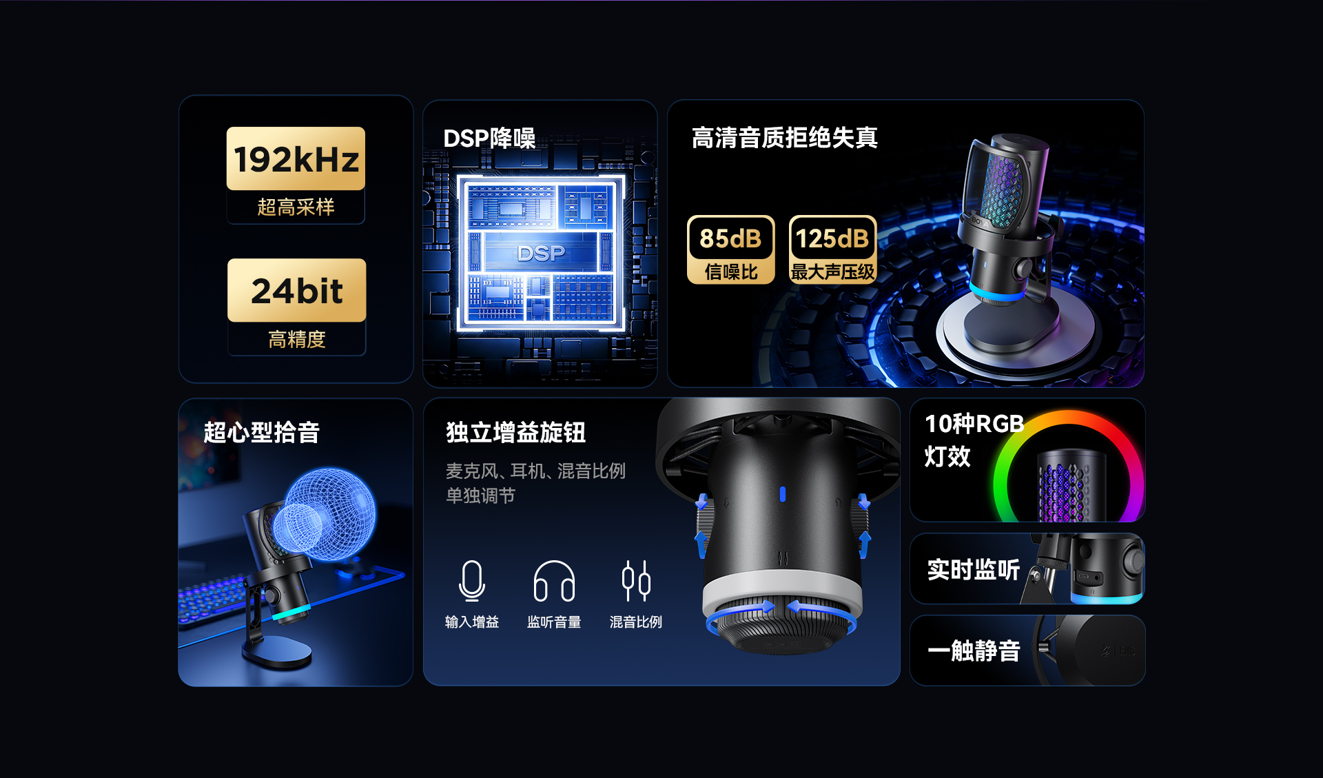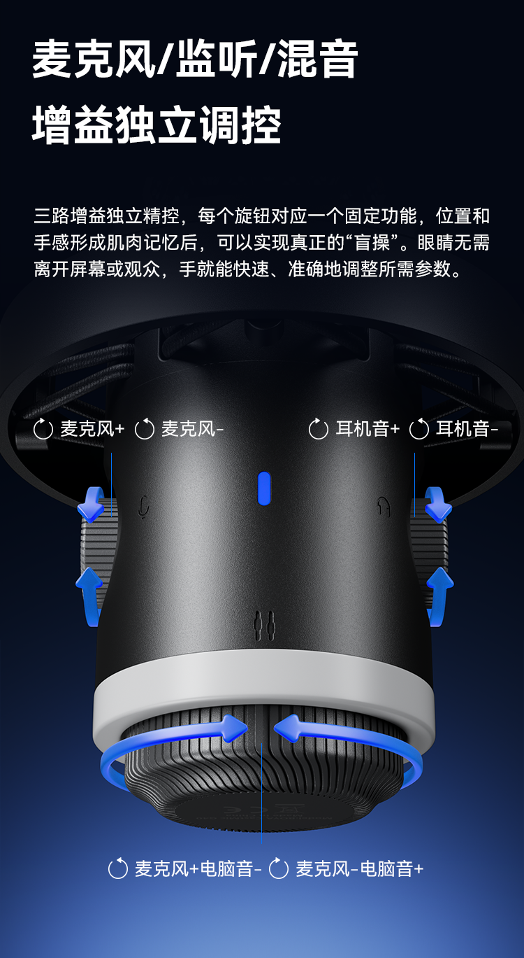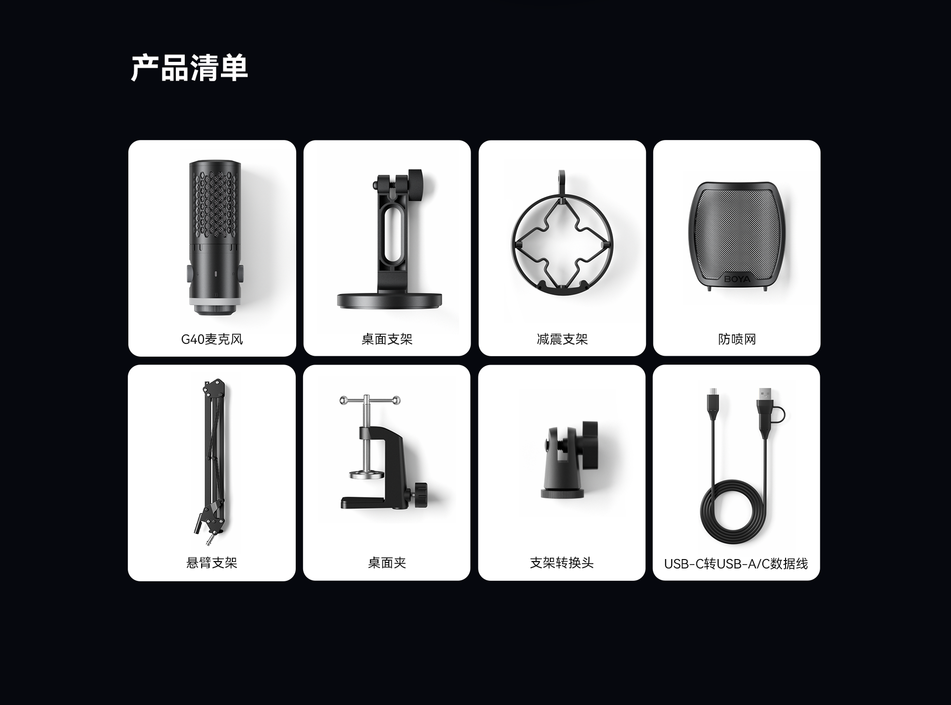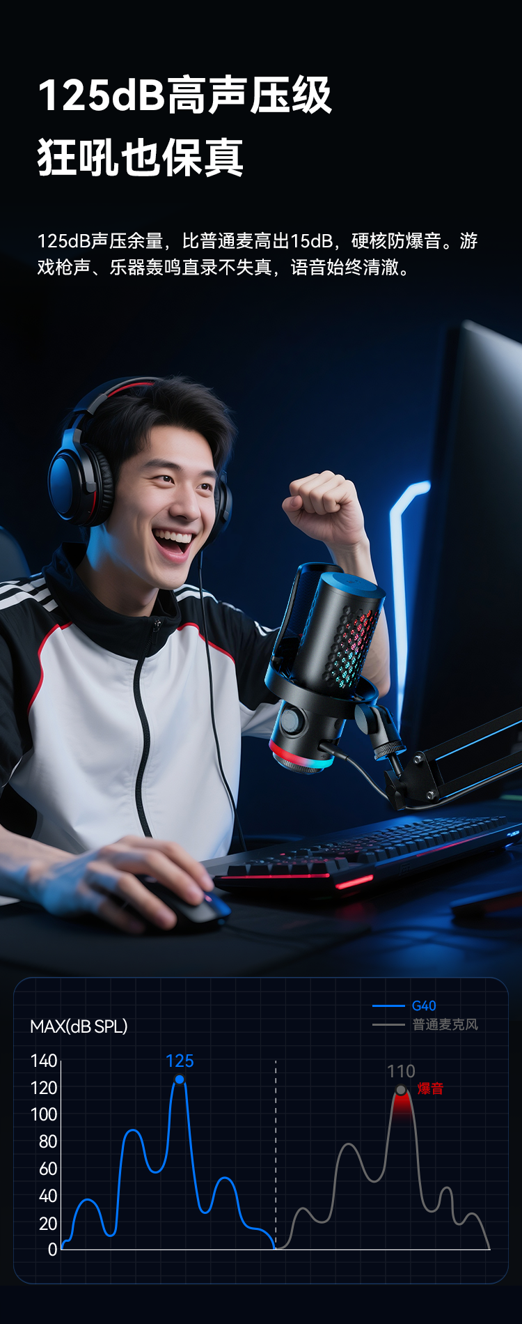 BOYA CastMic G40是一款集高音质录音与炫酷RGB灯效于一体的电容式游戏麦克风。内置192kHz/24bit高采样率声卡,ENC降噪算法搭配DSP芯片清晰收音,设置麦克风/耳机/混音比例三区增益调控旋钮,支持3.5mm耳机监听,USB接口直连手机、平板或电脑来录制音频,从游戏开黑、直播互动到专业内容创作,G40皆能胜任。