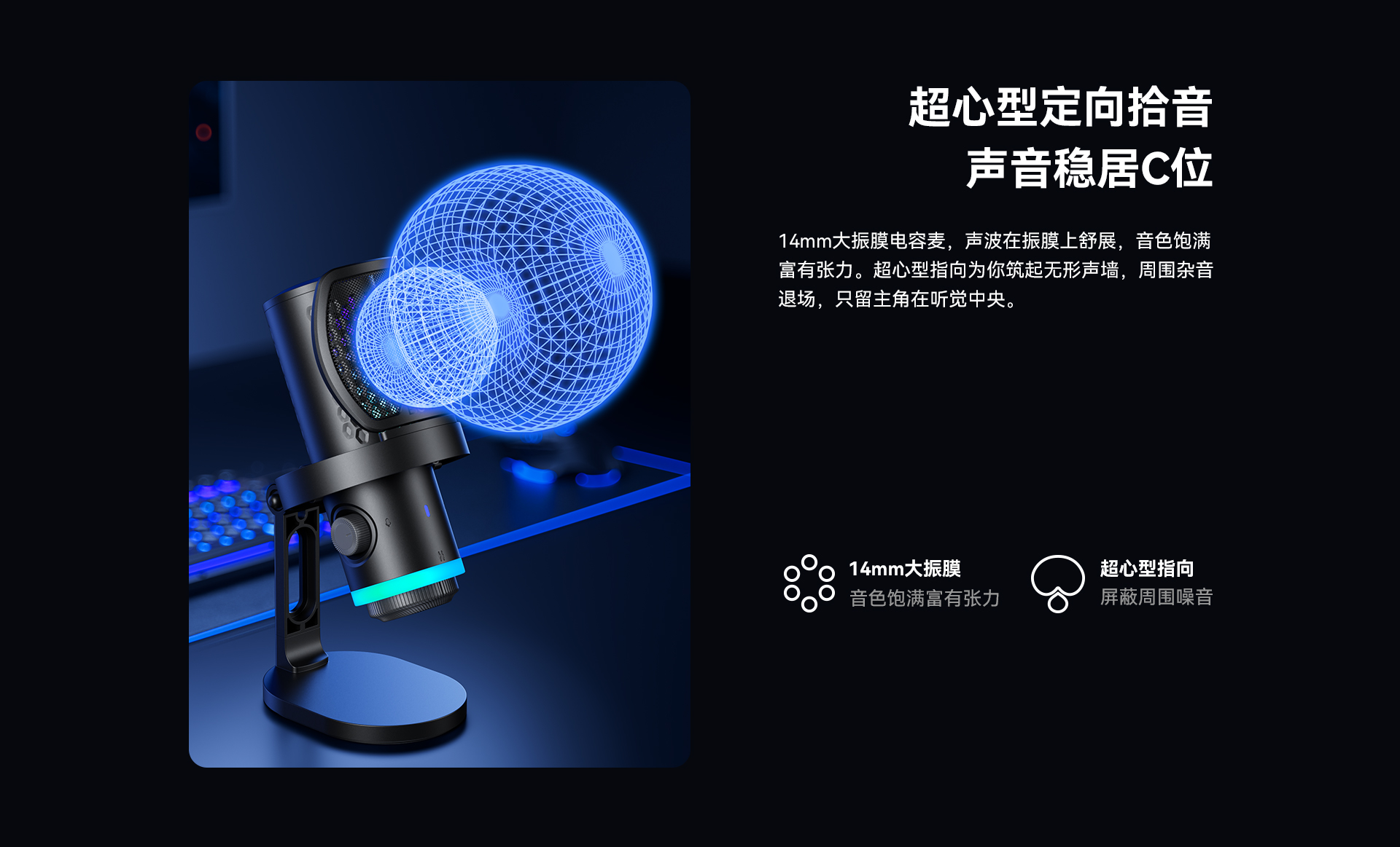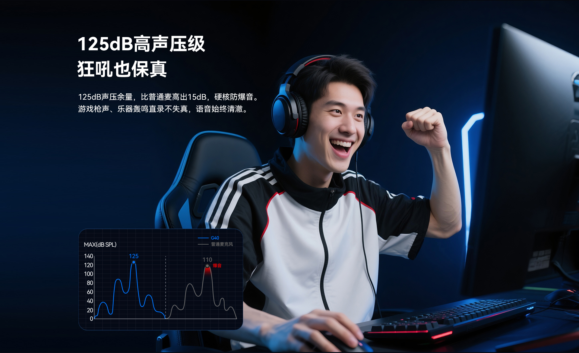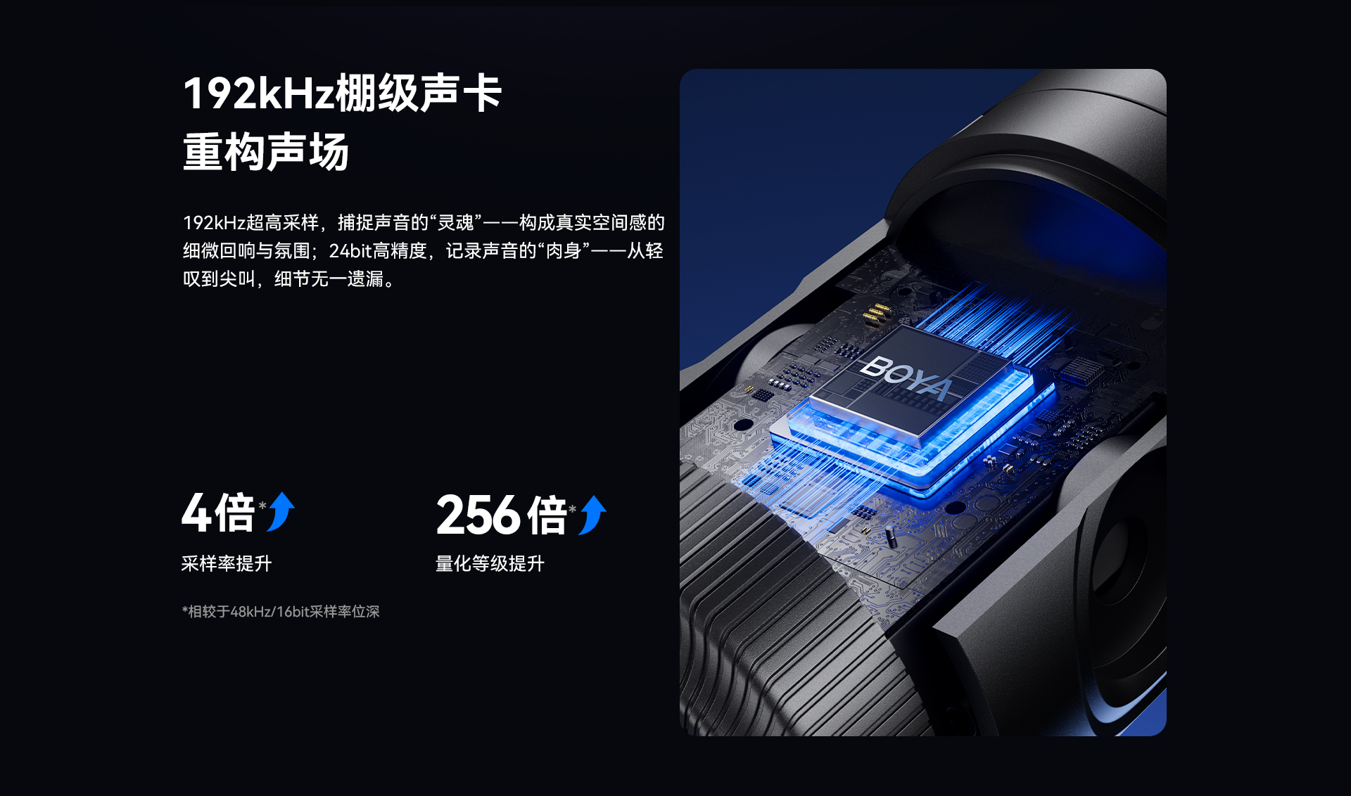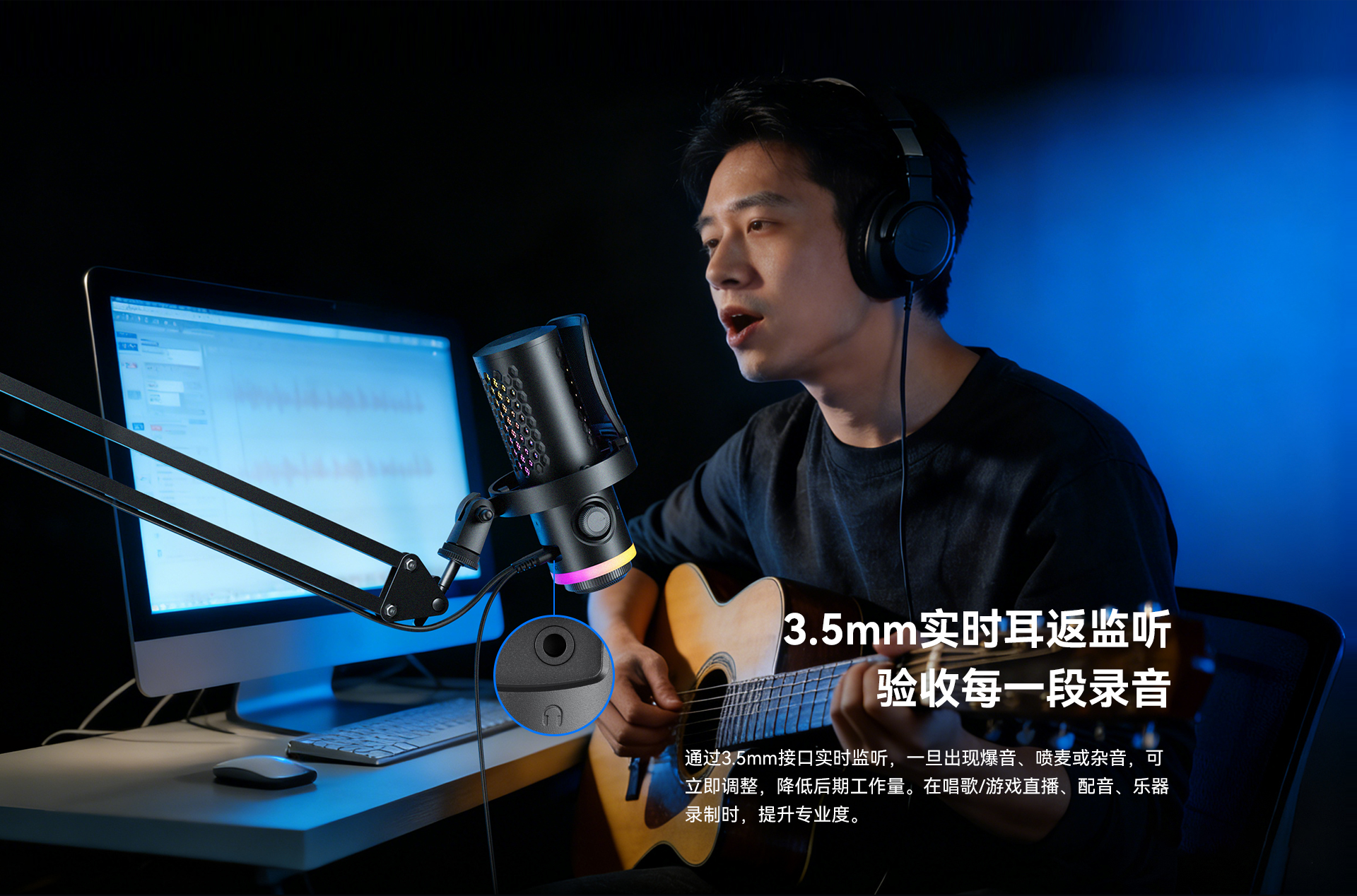 BOYA CastMic G40是一款集高音质录音与炫酷RGB灯效于一体的电容式游戏麦克风。内置192kHz/24bit高采样率声卡,ENC降噪算法搭配DSP芯片清晰收音,设置麦克风/耳机/混音比例三区增益调控旋钮,支持3.5mm耳机监听,USB接口直连手机、平板或电脑来录制音频,从游戏开黑、直播互动到专业内容创作,G40皆能胜任。
